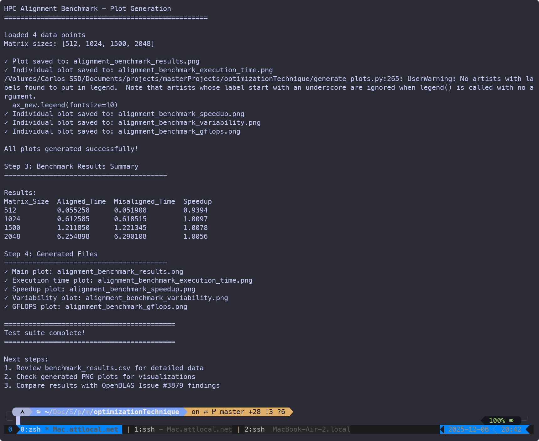 - Add C implementation demonstrating memory alignment effects (matrix_alignment_prototype.c) - Include cache-blocked matrix multiplication with AVX SIMD optimizations - Add automated benchmarking framework (run_all_tests.sh, run_benchmark_sizes.sh) - Add Python visualization scripts (generate_plots.py) - Include Makefile for building with AVX support - Add benchmark results and generated plots - Add README with build and usage instructions - Configure .gitignore for C/Python project files